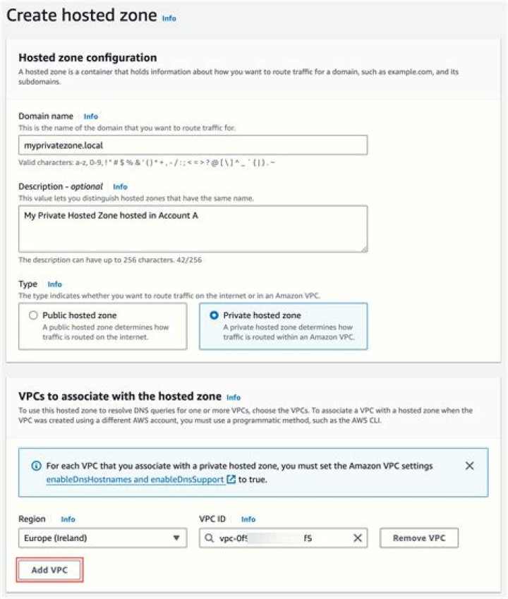VPCIdandVPCRegionare also required.To associate additional Amazon VPCs with the hosted zone, use AssociateVPCWithHostedZone after you create a hosted zone.