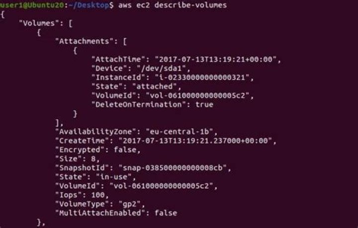 { "VolumeStatuses": [ { "VolumeStatus": { "Status": "ok", "Details": [ { "Status": "passed", "Name": "io-enabled" }, { "Status": "not-applicable", "Name": "io-performance" } ] }, "AvailabilityZone": "us-east-1a", "VolumeId": "vol-1234567890abcdef0", "Actions": [], "Events": [] } ]}