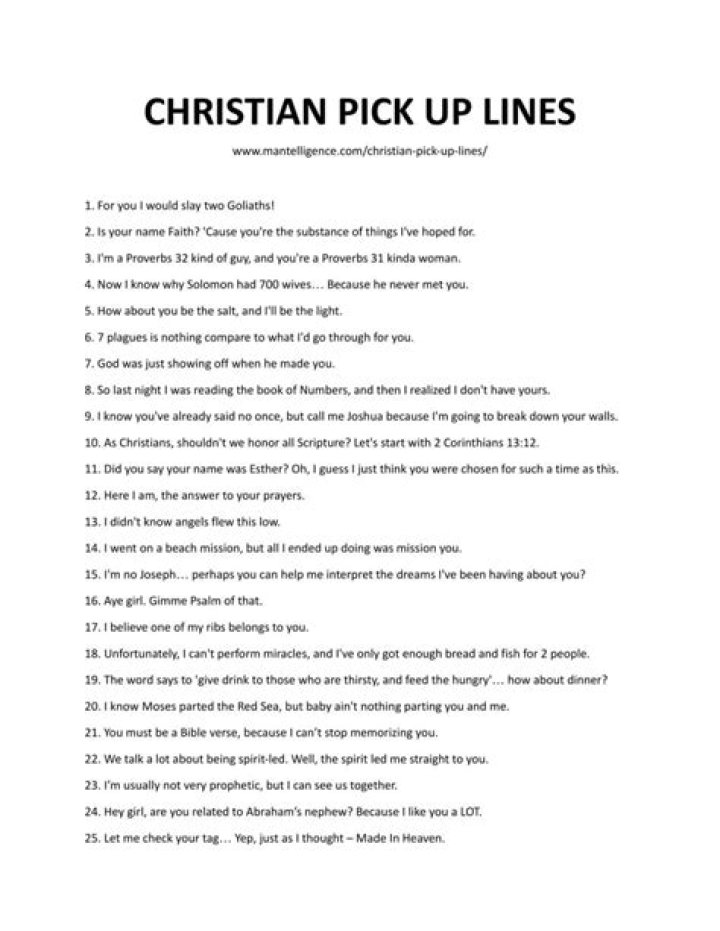 • Creativity and Originality: Bible verse pick up lines demonstrate creativity and originality, which can be particularly appealing to those who appreciate clever and witty humor. This can help to make a memorable first impression and set the tone for a fun and engaging conversation.