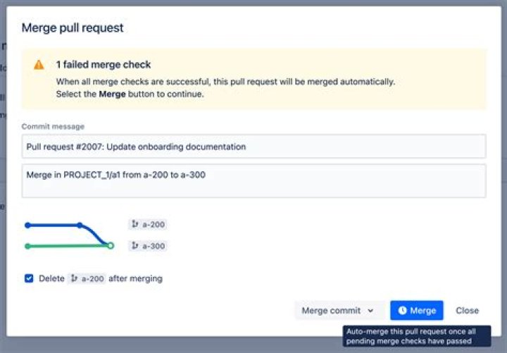 Attempts to merge the source commit of a pull request into the specified destination branch for that pull request at the specified commit using the fast-forward merge strategy. If the merge is successful, it closes the pull request.