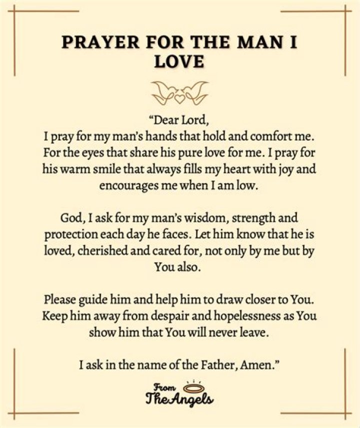 Prayers for the man you love are heartfelt expressions of devotion, seeking divine guidance, protection, and well-being for the cherished man in one's life. Rooted in faith and love, these prayers convey a deep connection and a desire for the man's spiritual, emotional, and physical fulfillment.